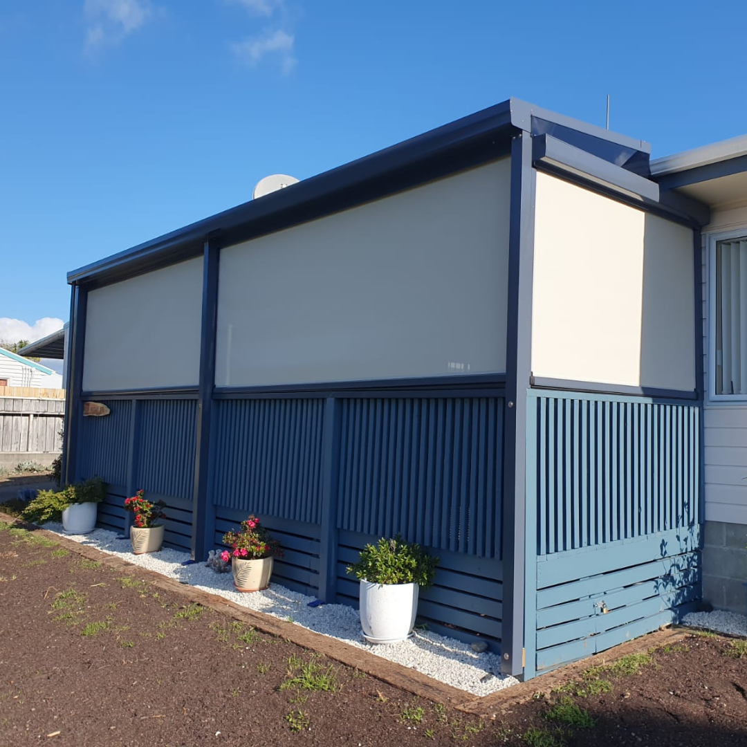 This Parua Bay install extended a tiny home’s outdoor living with 3 wide Ziptrak Blinds in Pebble Stone mesh seamless, stylish and ready when the pergola was.