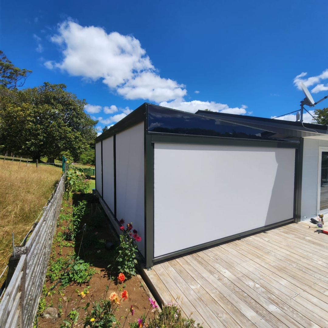 This Parua Bay install extended a tiny home’s outdoor living with 3 wide Ziptrak Blinds in Pebble Stone mesh seamless, stylish and ready when the pergola was.