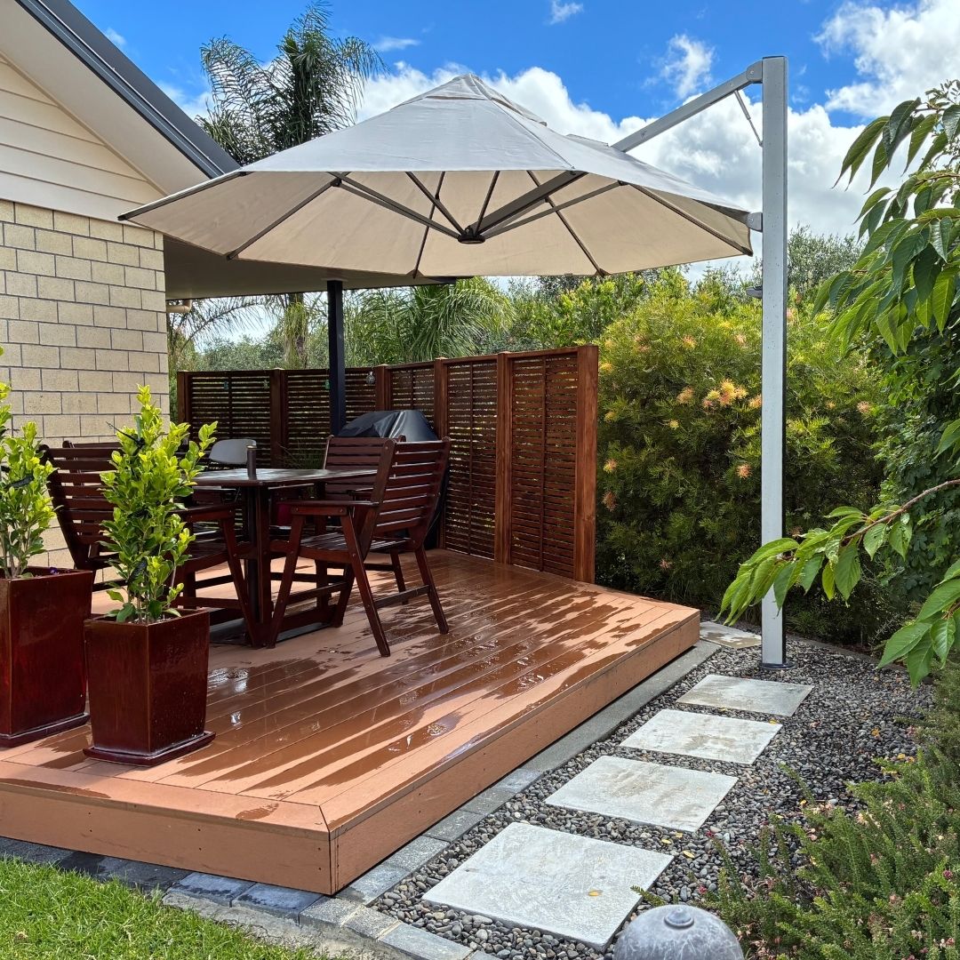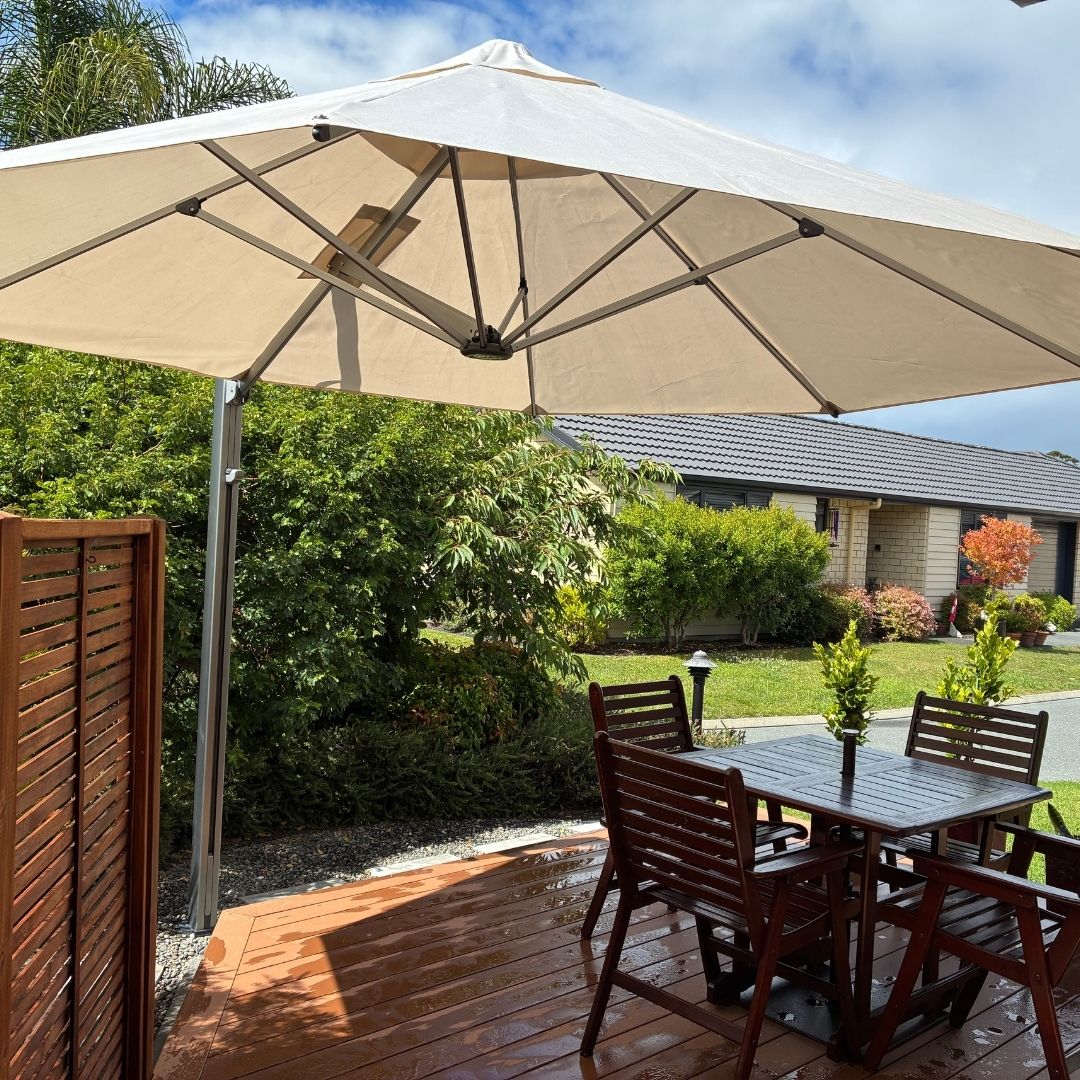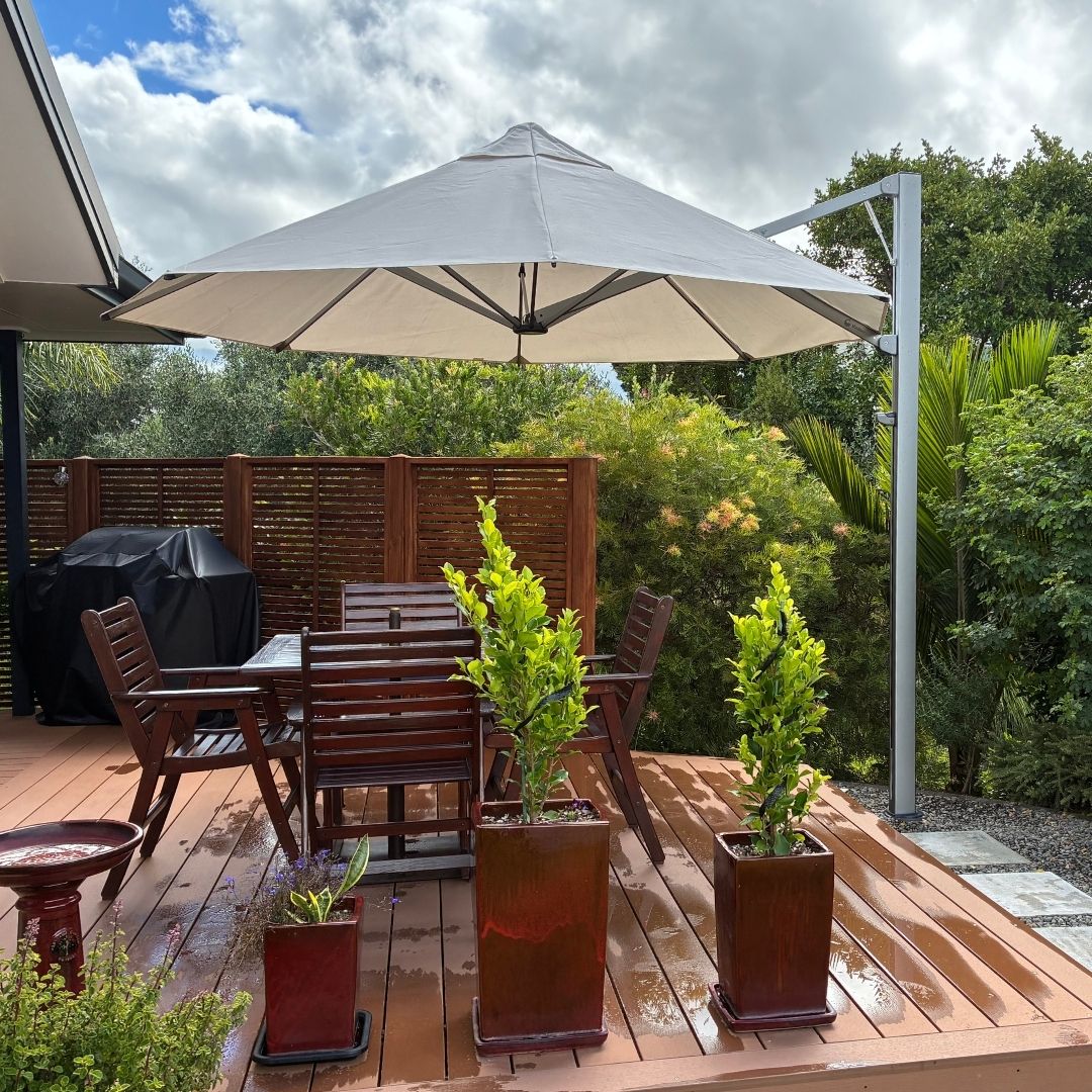 A clever dual umbrella install in Bream Bay gave Maxine the shade she wanted without giving up deck space just in time for summer.